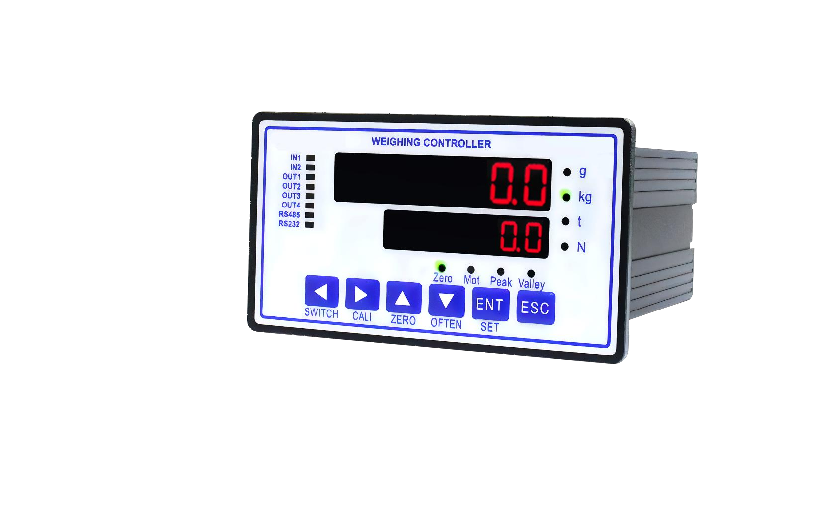 防护等级IP65,中英文菜单,4DI输入,7DO输出,支持1000000显示分度,波特率自适应特性,通讯方式,RS232/RS485 /TCP/模拟量可选。