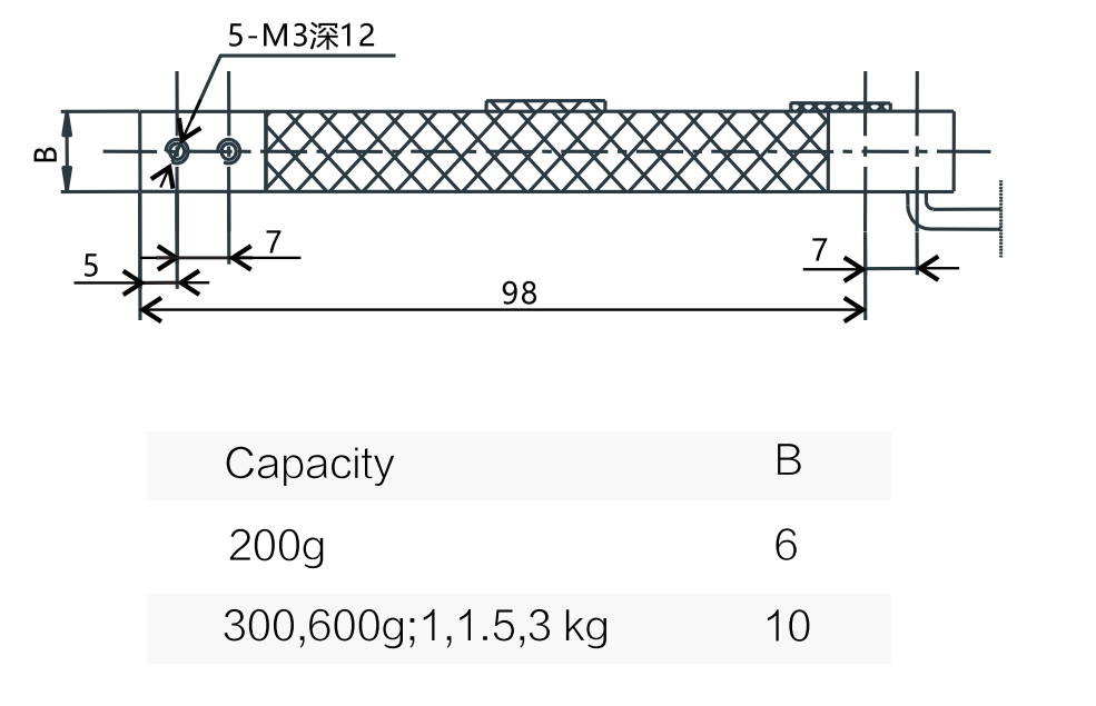 - 输出灵敏度:0.8-1.0/%mV/V(200g-300g);2.0/%mV/V(600g,1-3kg)
